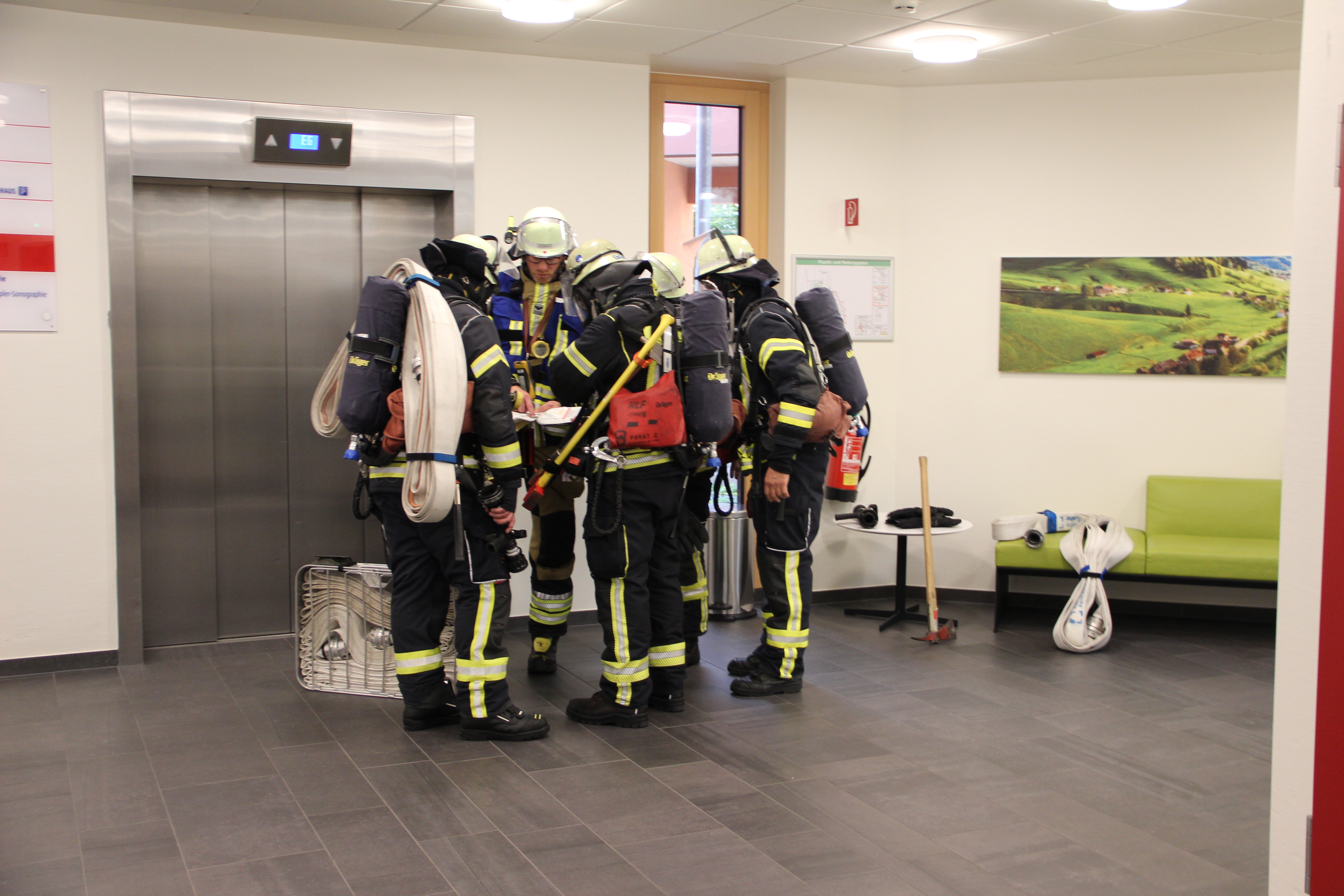 Kurz nach 16 Uhr werden die Mitglieder der Klinikeinsatzleitung (KEL) über eine interne Großschadenslage informiert und treffen sich im vorbereiteten Lageraum. Ein Verbindungsbeamter der Polizei ist ebenfalls anwesend, und Informationen treffen schnell ein.