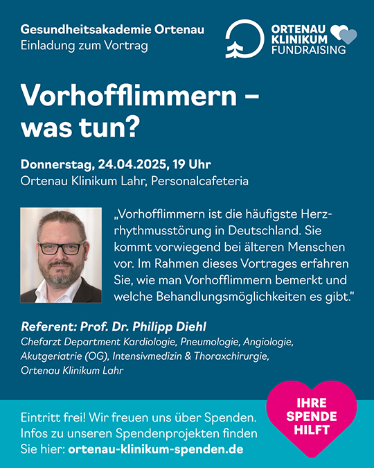 Referent: Prof. Dr. Philipp Diehl, Chefarzt Department Kardiologie, Pneumologie, Angiologie, Akutgeriatrie (OG), Intensivmedizin & Thoraxchirurgie, Ortenau Klinikum Lahr